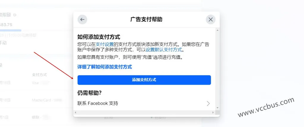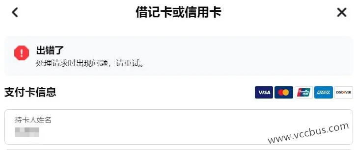 在使用 Facebook 广告个人账户绑定信用卡时,可能会出现“出错了,处理请求时出现问题,请重试”的错误提示,如下图所示: