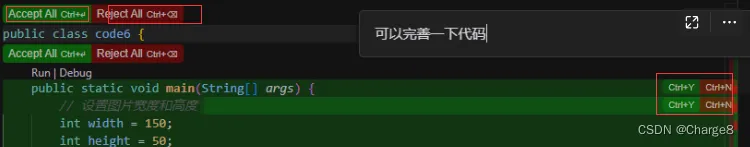点击左上角或按快捷键: Ctrl+Y表示接受修改的代码Ctrl+N表示拒绝修改的代码