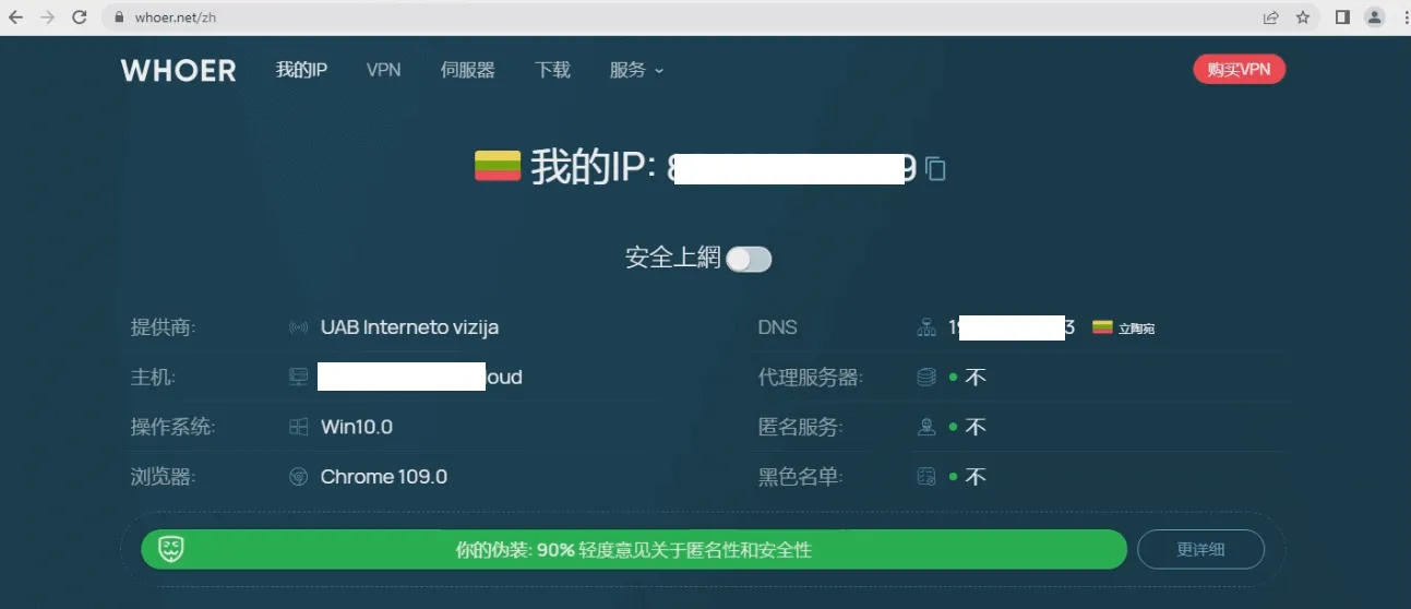 在注册前,建议使用 Whoer.net 检测网络 IP 的匿名性和安全性,最好达到 90% 以上。
