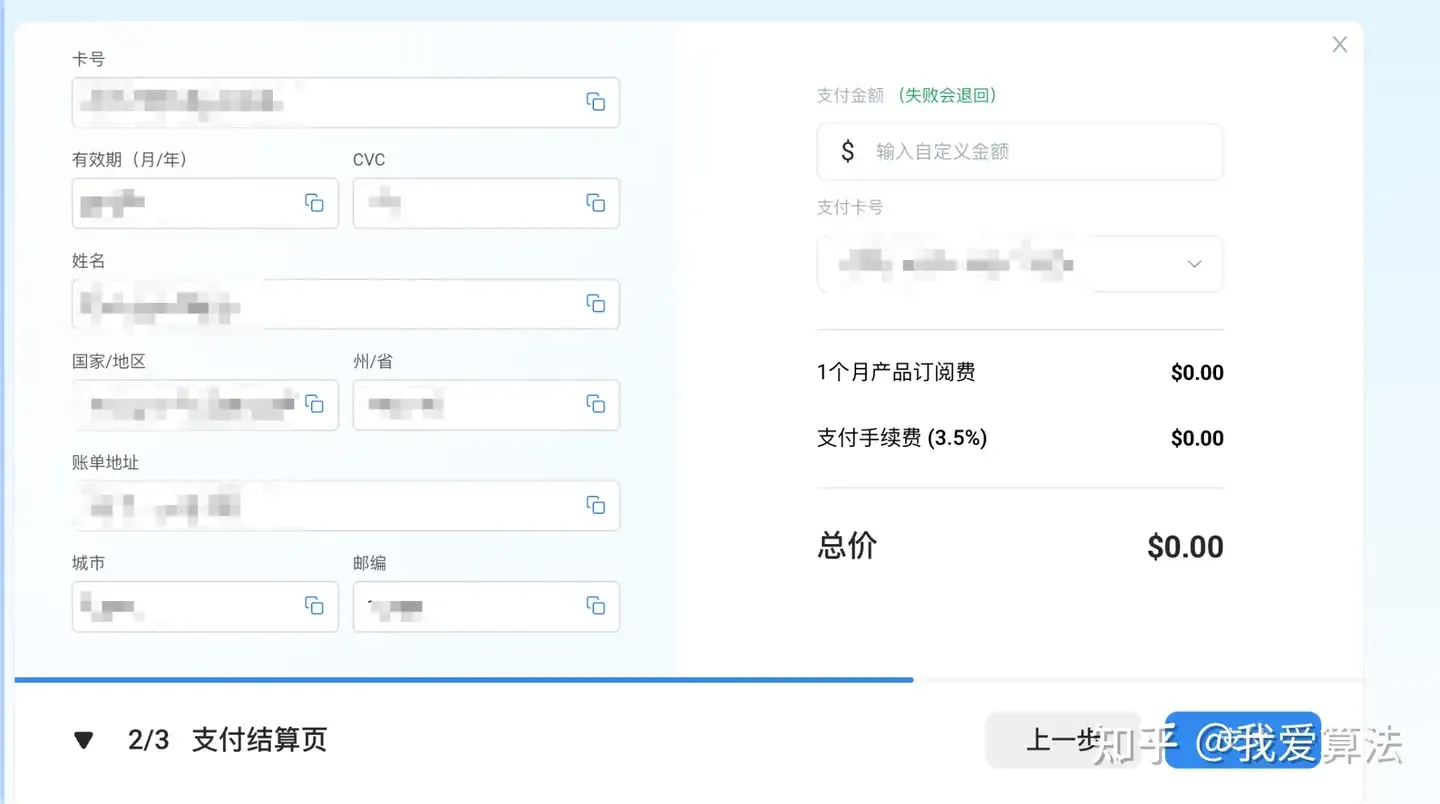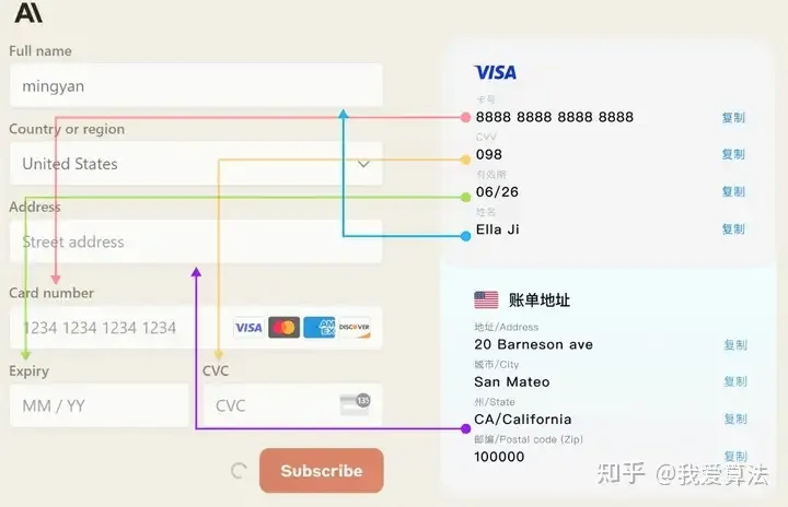 - 将当前虚拟卡的信息复制并绑定到之前Cursor的绑卡页面。可以参考下面Claude的绑卡形式。