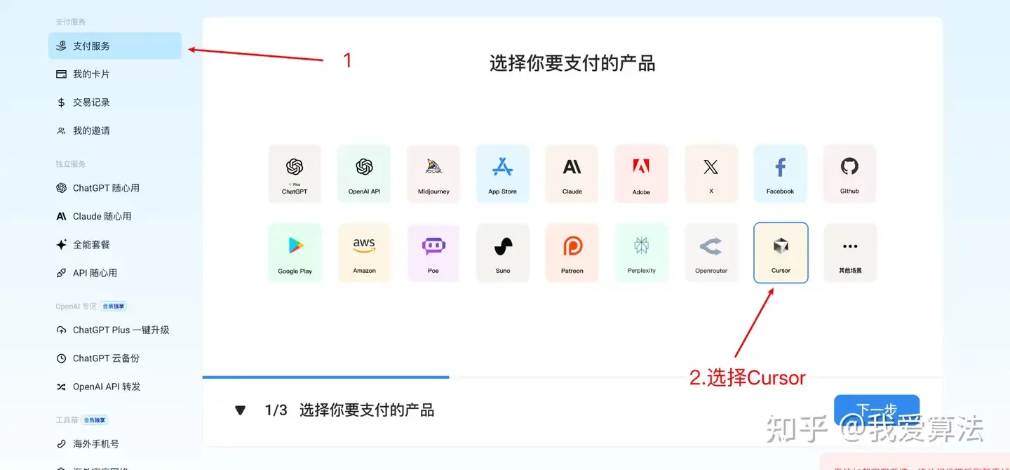 - 在侧边栏,选择“支付服务”,然后选择Cursor服务。