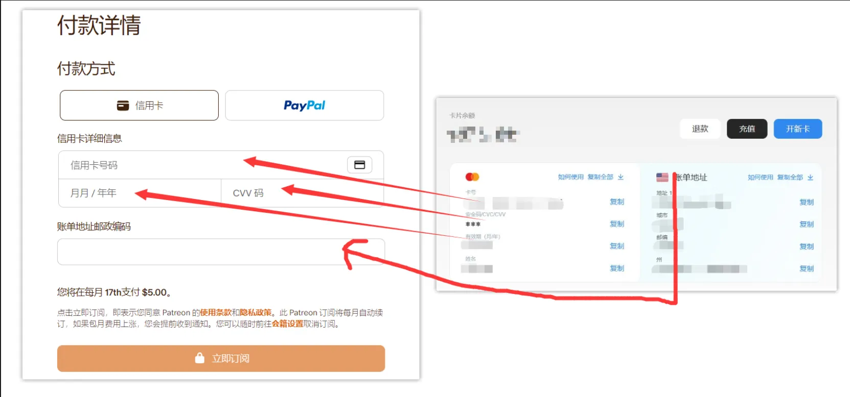 接下来详细介绍如何使用购买的虚拟卡订阅 Patreon。