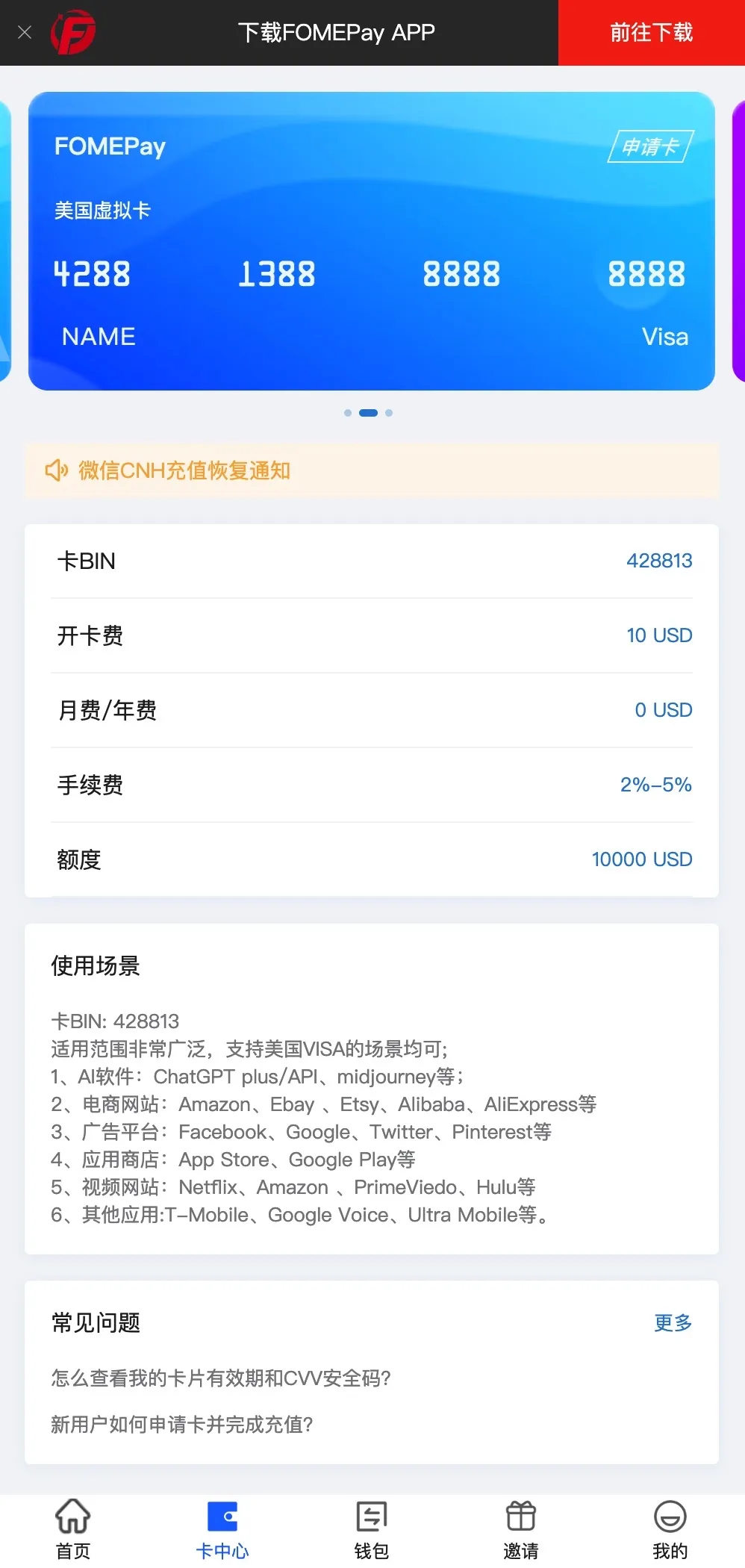 当然,FOMEPay 也有其不足之处,开卡费为 $10,具体是否接受视个人需求而定,毕竟大多数平台都需要开卡费。