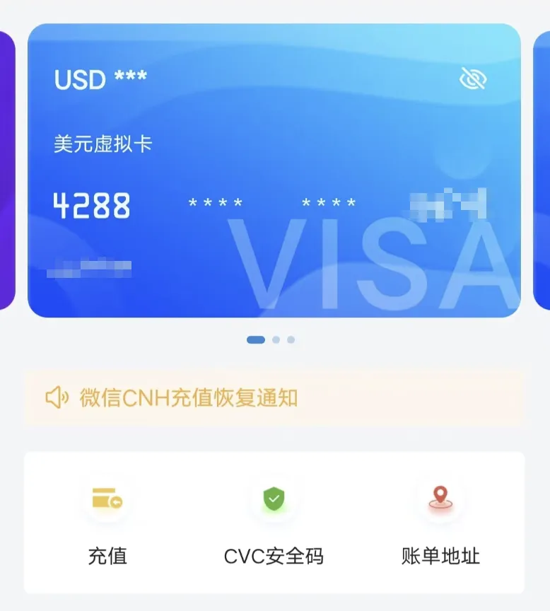 - 虚拟卡申请完成后,点击「充值」按钮。
