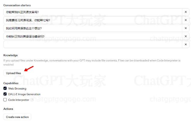 - Capabilities: 拓展能力,GPT内部提供,包括网页浏览、DALL-E图像生成、代码解释器