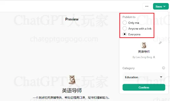 测试好之后,点击右上角的“Save”按钮。你可以选择让你的GPT仅向自己开放、仅限特定用户访问或者公开。然后选择“Confirm”完成创建。