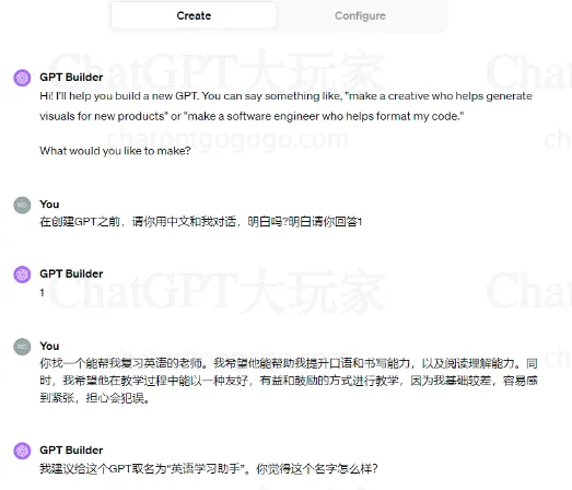 这里,我们以创建一个提升英语水平的GPTs为例,以下是详细操作步骤。