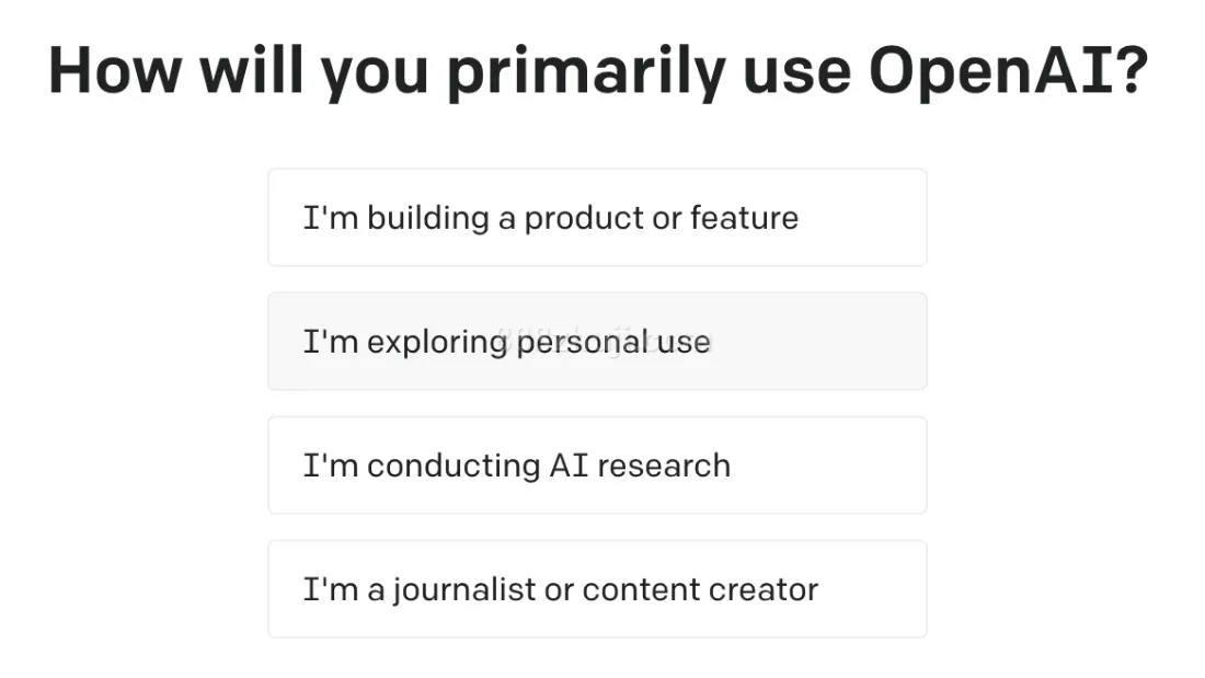 注册后,选择一个用途来使用 OpenAI,便可开始使用 ChatGPT。