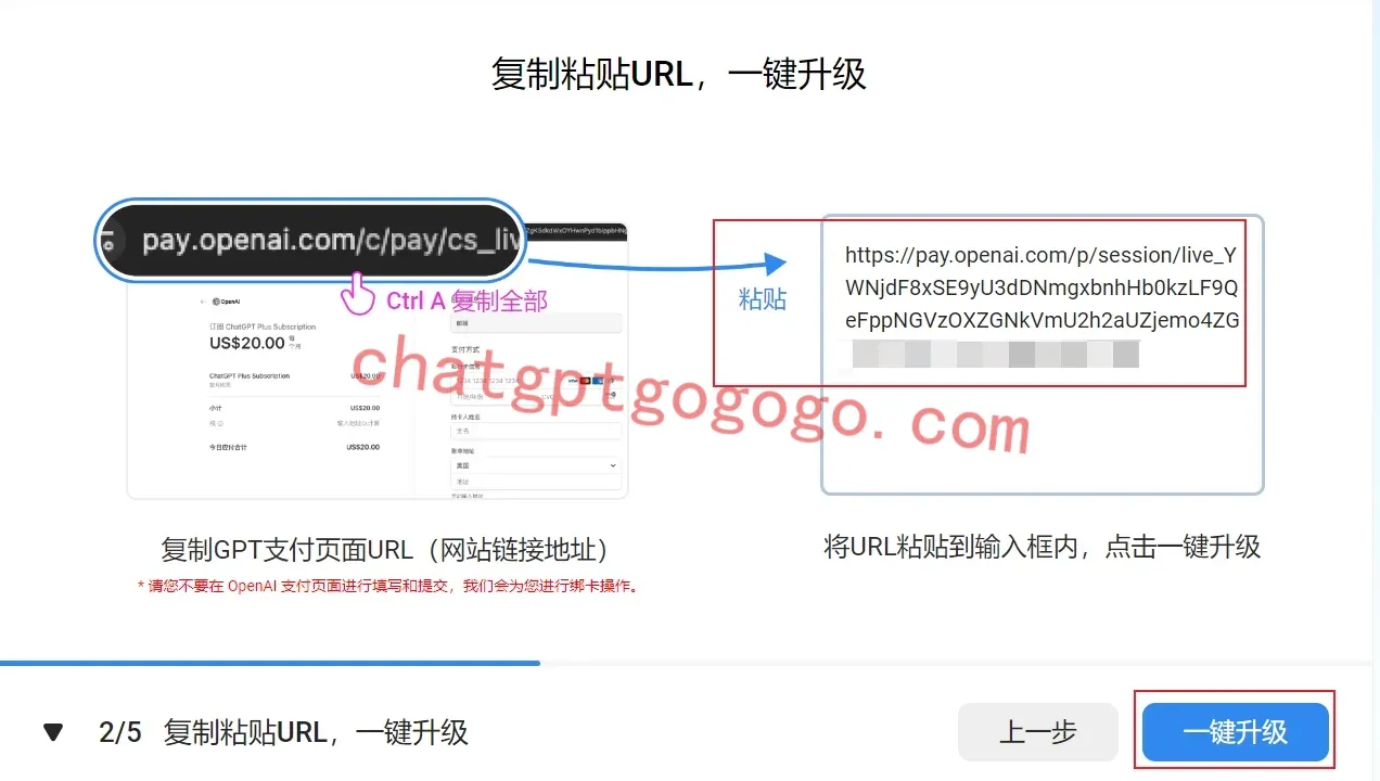 按照网站上给出的教程,一步步操作,基本上两分钟之内就可以完成 ChatGPT Plus 升级。