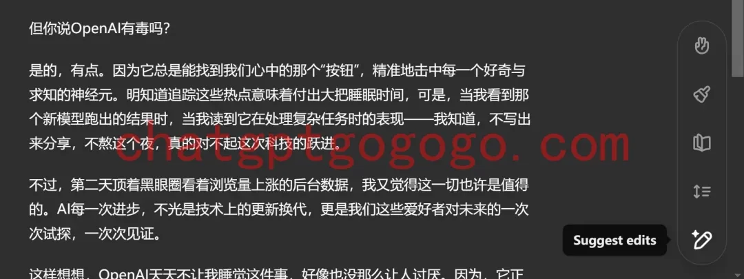 文本可以滑动选中,选中后可以直接对话,让 ChatGPT 仅对这段话进行修改,也可以加粗、斜体或调整字号等。