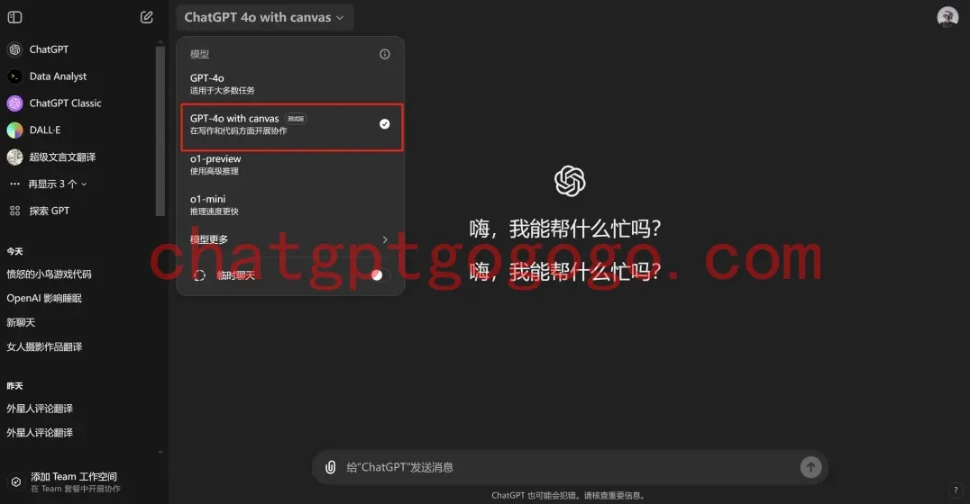 接下来就可以愉快体验 GPT-4o with Canvas 模型的功能了。