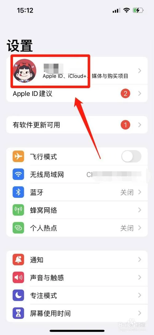 - 首先,打开苹果手机的系统设置,点击顶部的 Apple ID 头像进入账户设置。