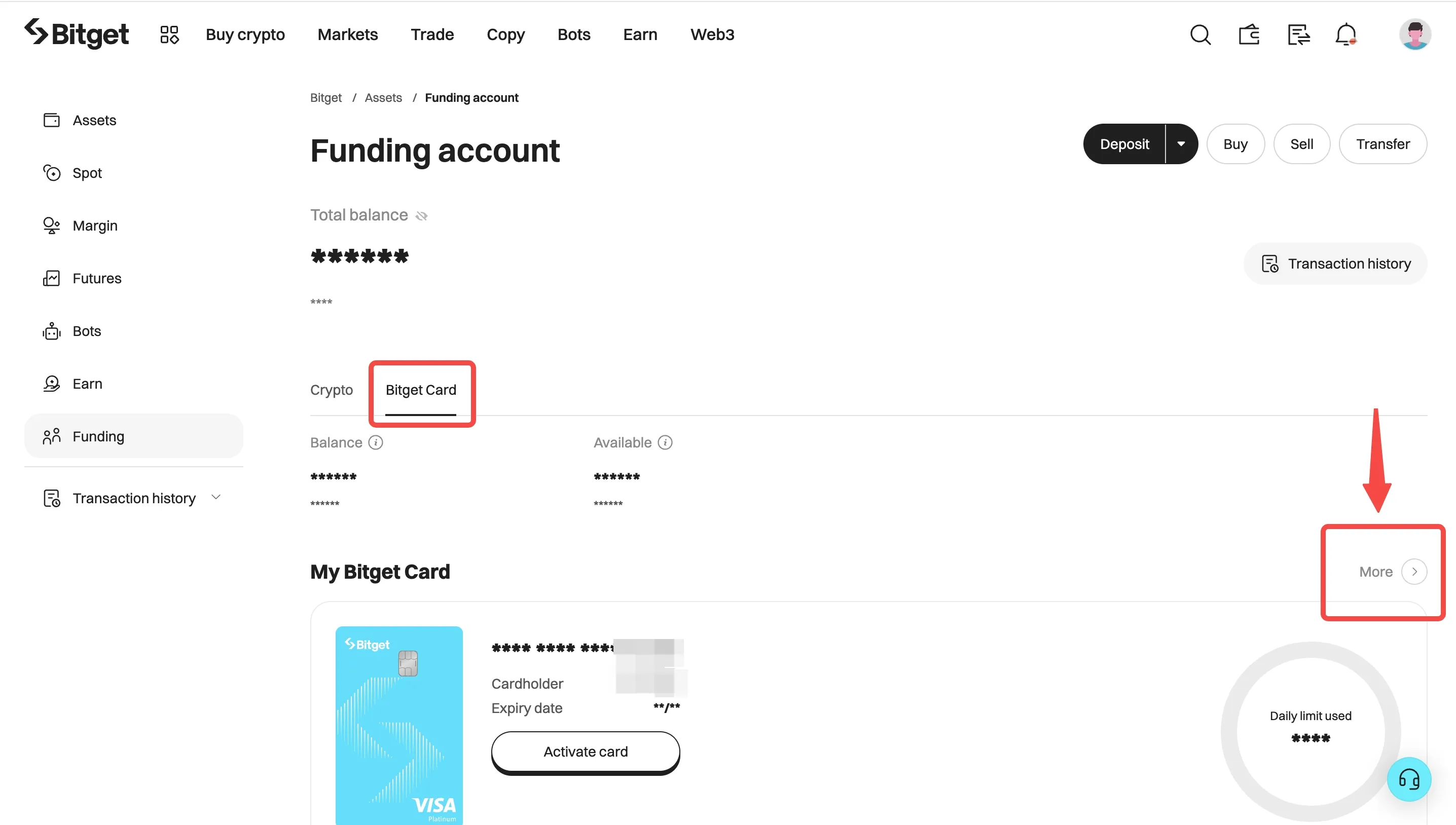 进入“钱包” => “资金账户” => “Bitget 信用卡”。