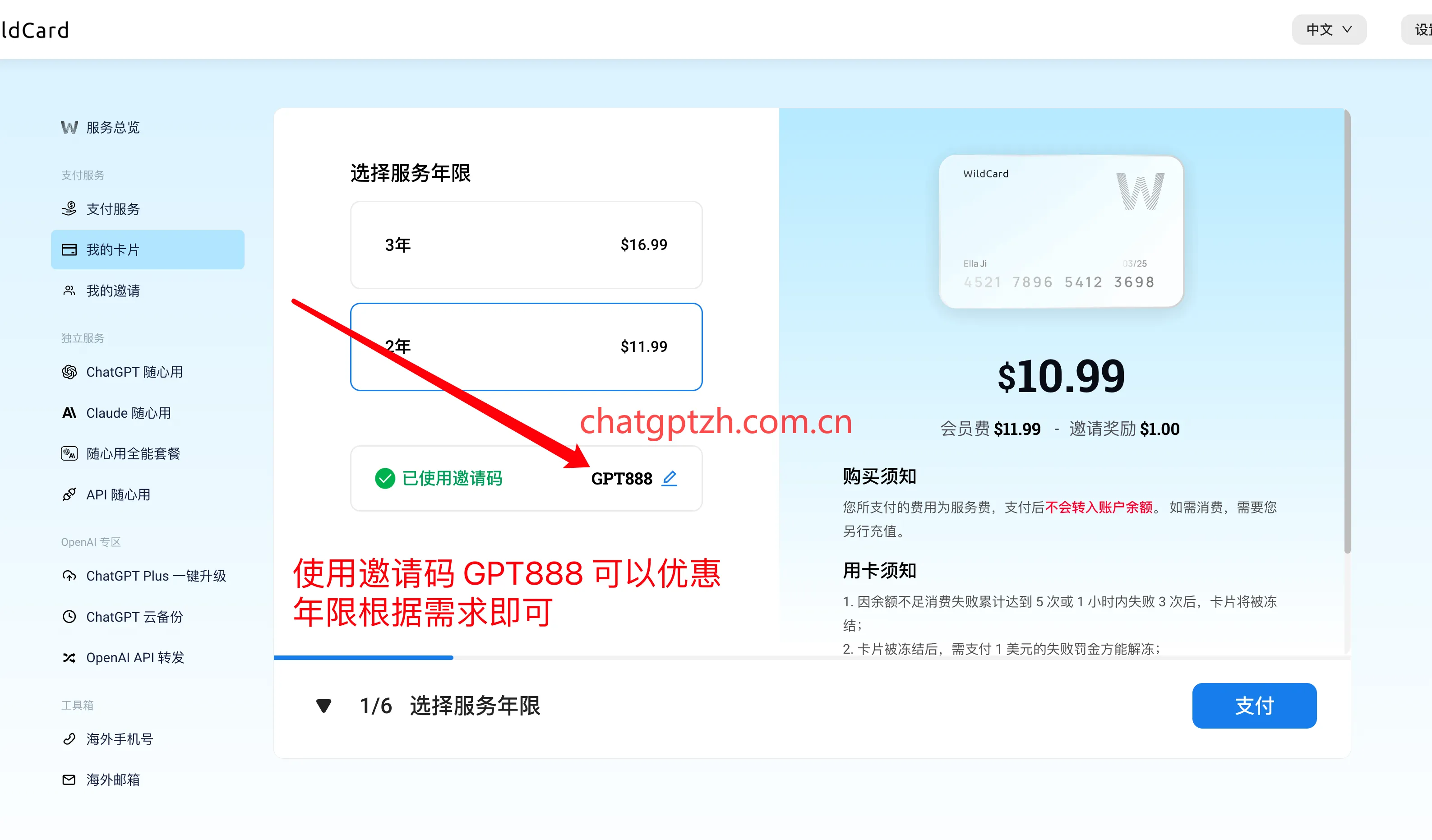 - 进入后,根据需求选择年限,记得填写 野卡 专属邀请码 ACCPAY,以获得优惠。