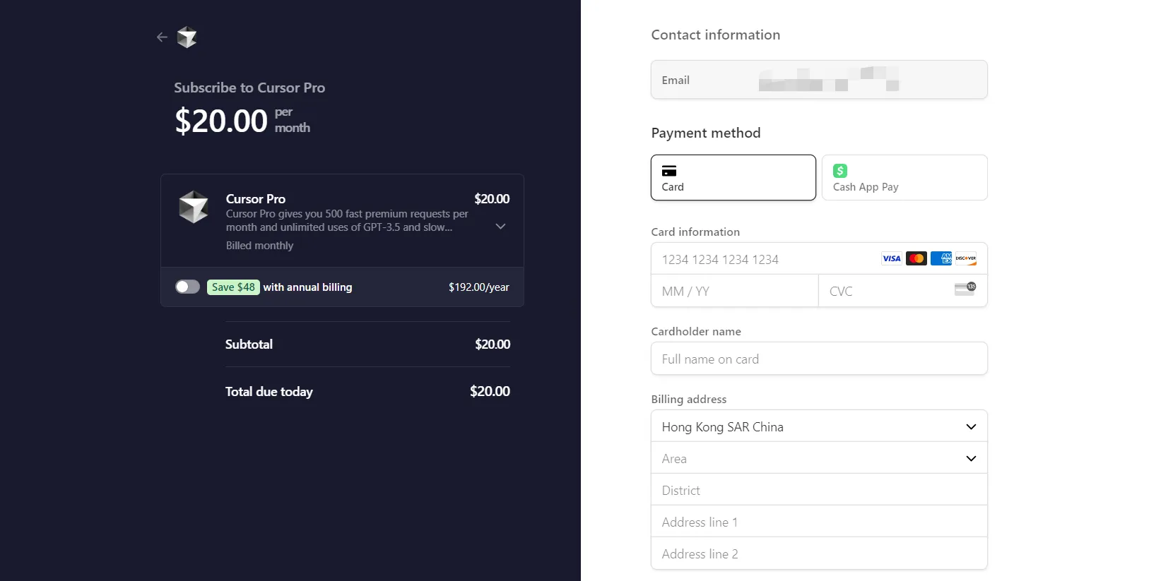 在国内,支付海外产品一直是个难题,Cursor并未对接微信支付和支付宝,用户必须使用 Visa 等信用卡。