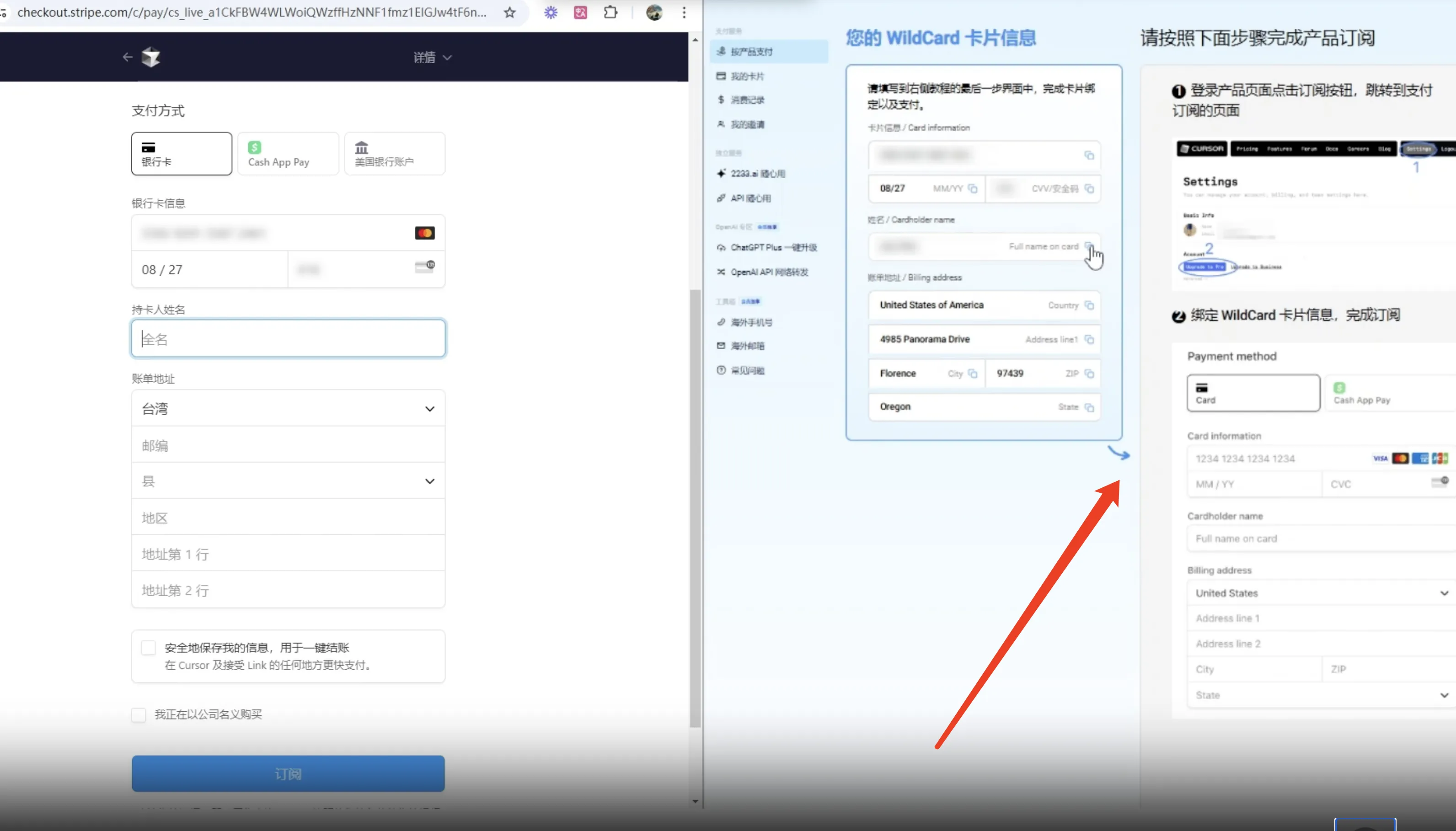 - 进入付款页面,填写在野卡申请的虚拟信用卡信息: