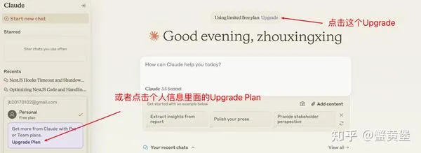 - 在 Claude AI 官网里,点击 “Upgrade”,即可跳转到订阅 Claude Pro 的页面,或者直接访问 Claude Pro 升级页面。