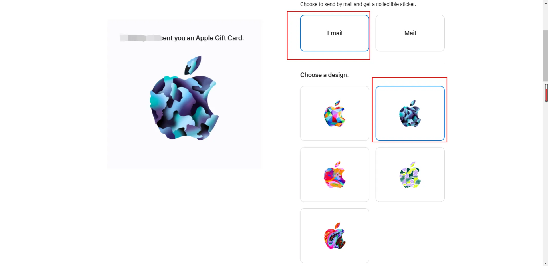 - 选择通过Email发送,并为礼品卡选择一个设计。