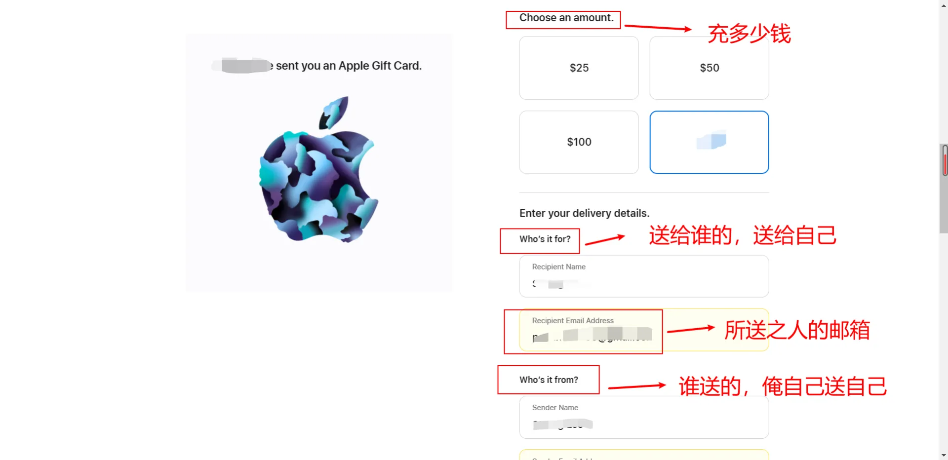 - 输入充值金额,选择如何接收虚拟电子卡,建议使用您的Apple ID邮箱。