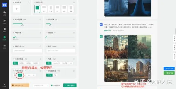 为了生成图像,您只需输入绘画的提示词。提示词是您对想画图的描述(支持中英文)。在绘画指令添加完成后,建议选择 V6 版本,其他参数可保持默认,稍等片刻,即可看到生成的图像。每次生成 4 张,您可以根据需要进行优化。