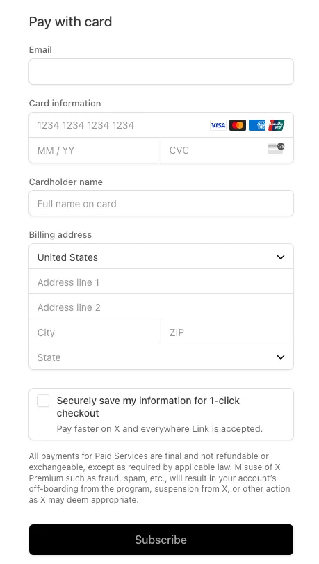 确认信息后,提交完成支付,您将可使用 X Premium 的全部功能。蓝色标记将在大约 5 个工作日后完成认证查验后出现。