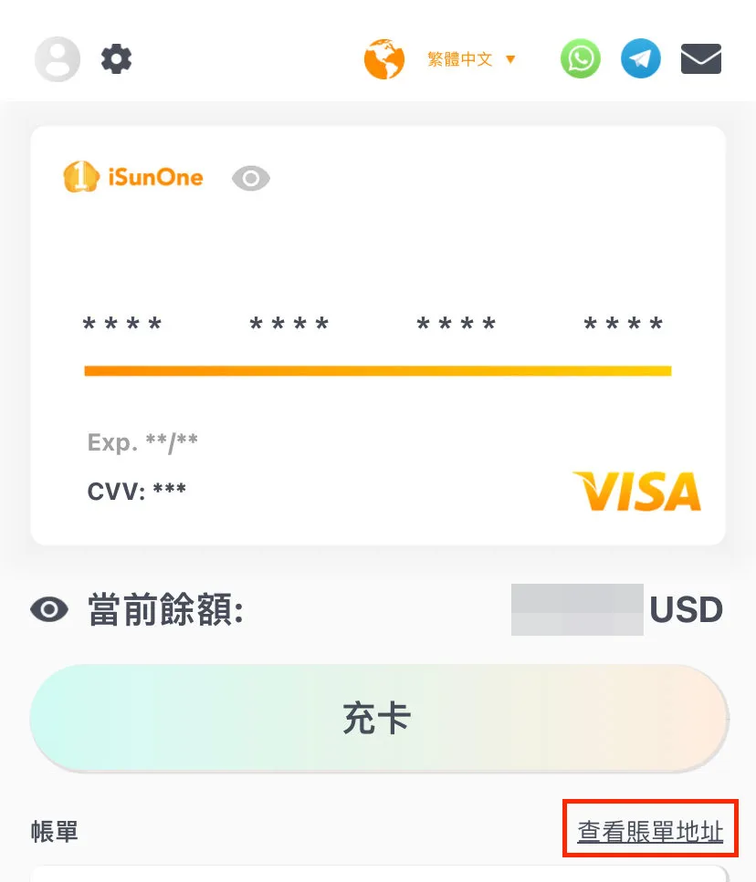 当您使用 iSunOne 全球 Visa 卡时,请于此找到您的账单地址: