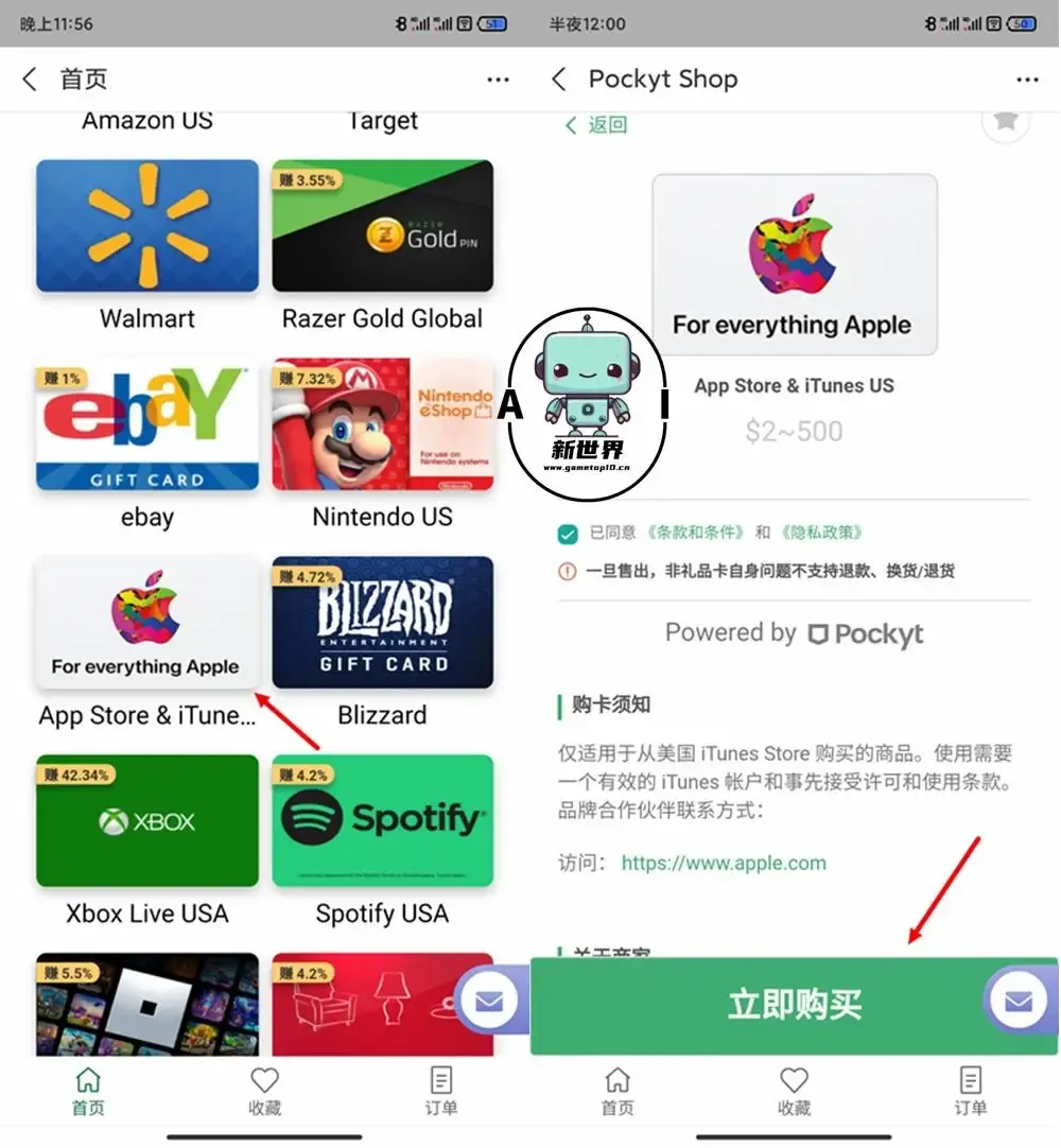 - 进入 更多大牌折扣礼卡 后,向下拉找到 App Store & iTunes US,点击进入该礼品卡页面进行购买。