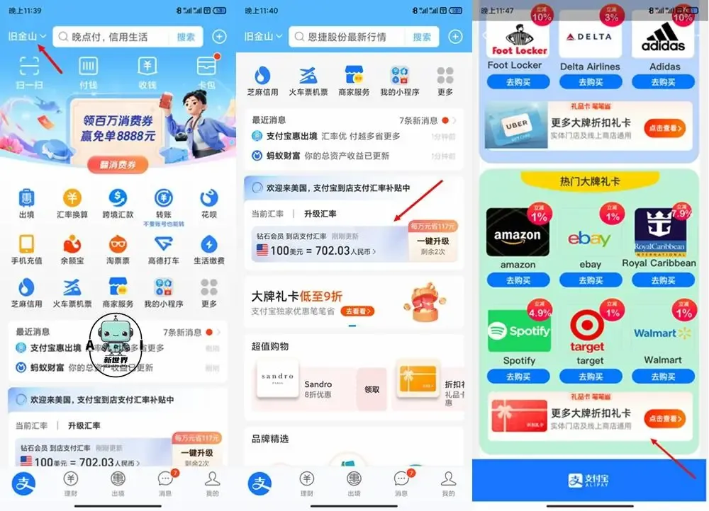 - 打开支付宝,点击左上角将定位改为美国任意城市,向下滑动页面找到 大牌礼品卡,点击进入后再滑动到最底部点击 更多大牌折扣礼卡。