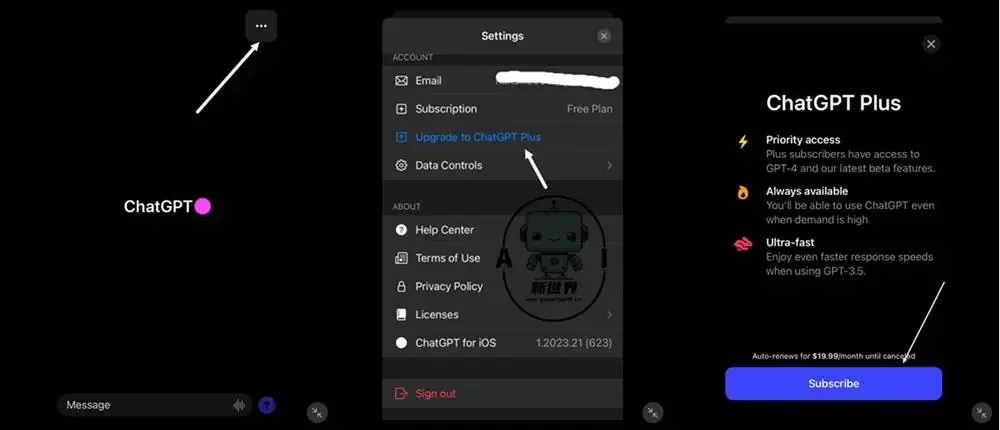 - 打开ChatGPT软件,点击右上角的 ···,选择 Settings,然后点击 Upgrade to ChatGPT Plus,最后点击 Subscribe 即可完成订阅。