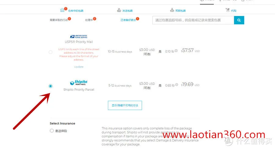 转运快递的选择也很丰富,最便宜的选项需要15美元,但不提供物流追踪信息,时效约为20-45天。选择Shipito Priority Parcel是性价比较高的,运费加包裹处理费共计22.69美元,时效为5-12天。