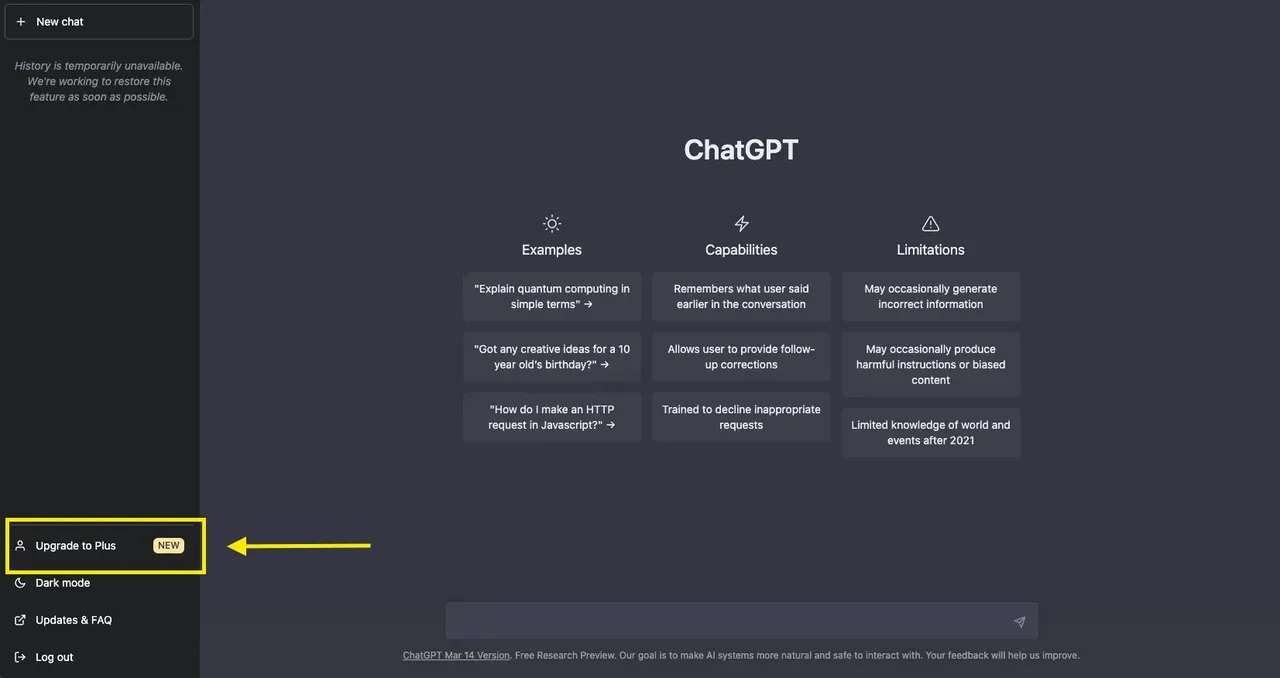 登录后,您将进入聊天机器人的主页。请注意右侧栏中的“升级到 Plus”按钮,点击它以进入下一步。