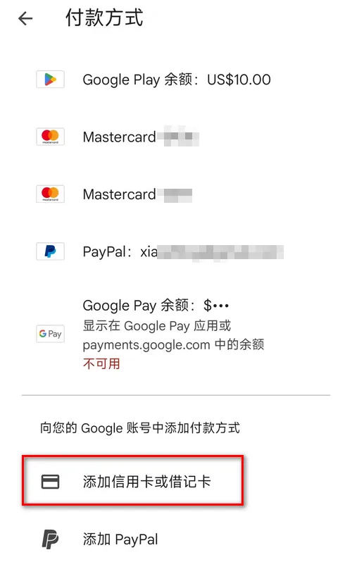 找到“添加信用卡或借记卡”,根据系统指引添加您的国内VISA/MasterCard信用卡。