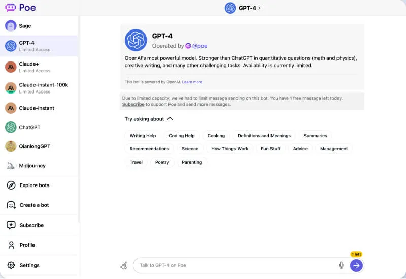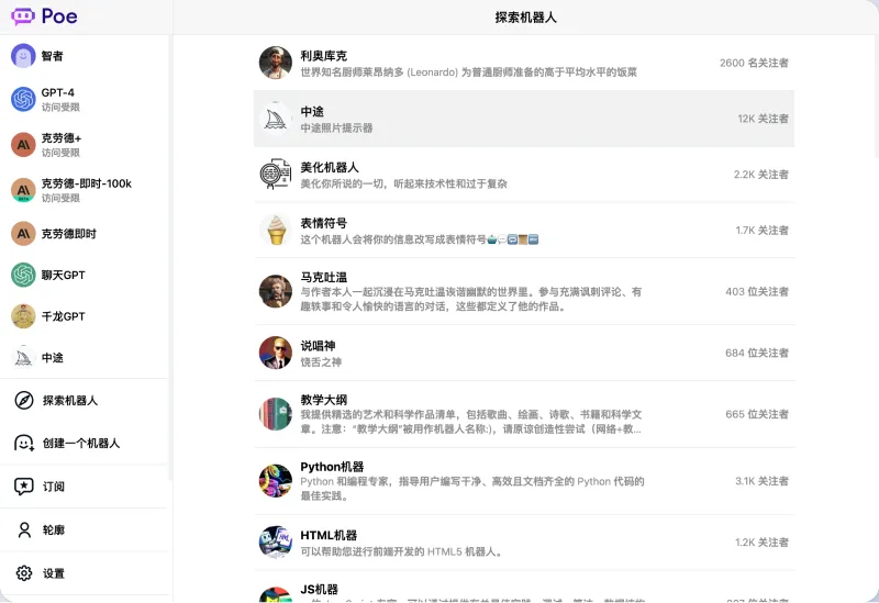 通过Poe平台,用户可以与多款机器人同时交互,主要包括以下几款模型: