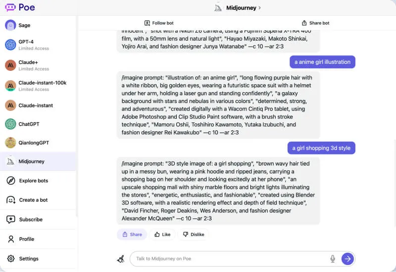 Poe还提供了一个机器人社区,用户可以查看和添加各类开发者自行训练的聊天机器人。例如,Midjourney机器人可以根据用户输入生成提示词。