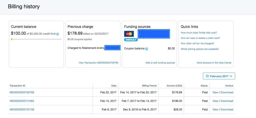 根据 Twitter 的计费系统,系统会自动从信用卡中扣款,频率从每天一次到最多每 7 天一次不等,具体取决于广告活动的支出情况。