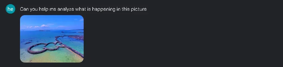 Gemini能够识别出图片中的细节,如图中显示的是一个位于海洋中的心形岩石结构,这种形象可以象征爱情、希望或自然之美。