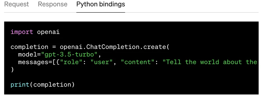 此外,OpenAI还提供了多种编程语言的实现代码示例。例如,在Python中,只需导入openai包,使用申请的API密钥,并选择最新的模型——gpt-3.5-turbo。