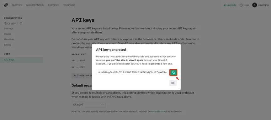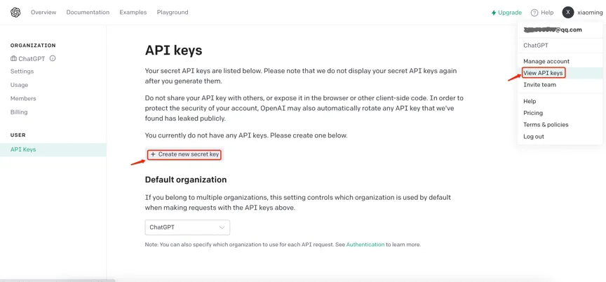 注册完成后,登录界面如下。点击右上角的“View API keys”并选择“Create new secret key”,即可生成您的API密钥。请注意,出于安全原因,该API密钥只会展示一次,请务必在关闭对话框前将其复制保存。