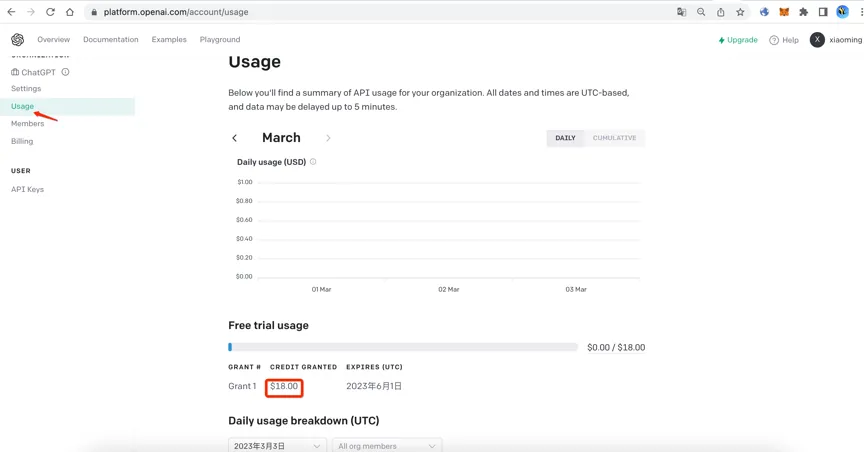 在左侧栏中点击“Usage”,可以清晰查看token的使用情况,数据每5分钟更新一次。OpenAI为每个新注册账户提供$18的免费token使用额度,考虑到前期花费不到$1,确实是个不错的选择。但请注意,免费额度有时间限制,过期后将作废。