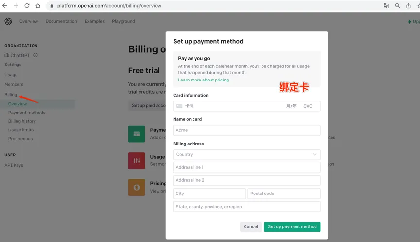 充值步骤请参考新手教程中的第二、三步。申请到虚拟信用卡后,登录OpenAI网站,点击右上角的账号信息,选择“Billing”,在此处绑定刚申请的卡号信息以进行ChatGPT API充值。