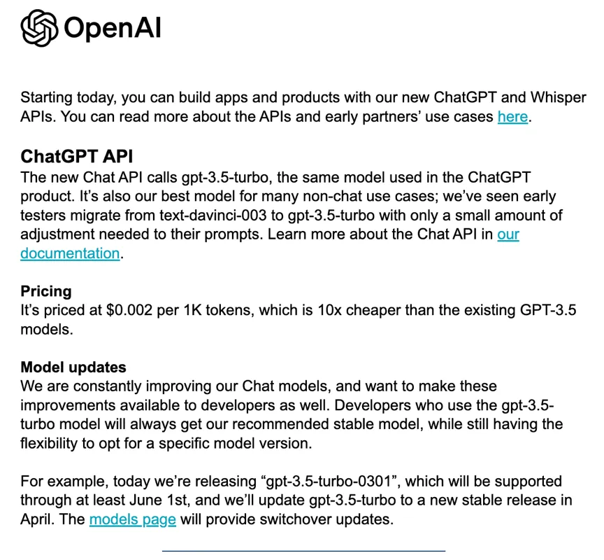 OpenAI最近推出了收费计划,开放了ChatGPT和Whisper API。ChatGPT API允许企业在其应用程序、网站和服务中集成ChatGPT功能,而Whisper API则实现了语音转文本的功能。