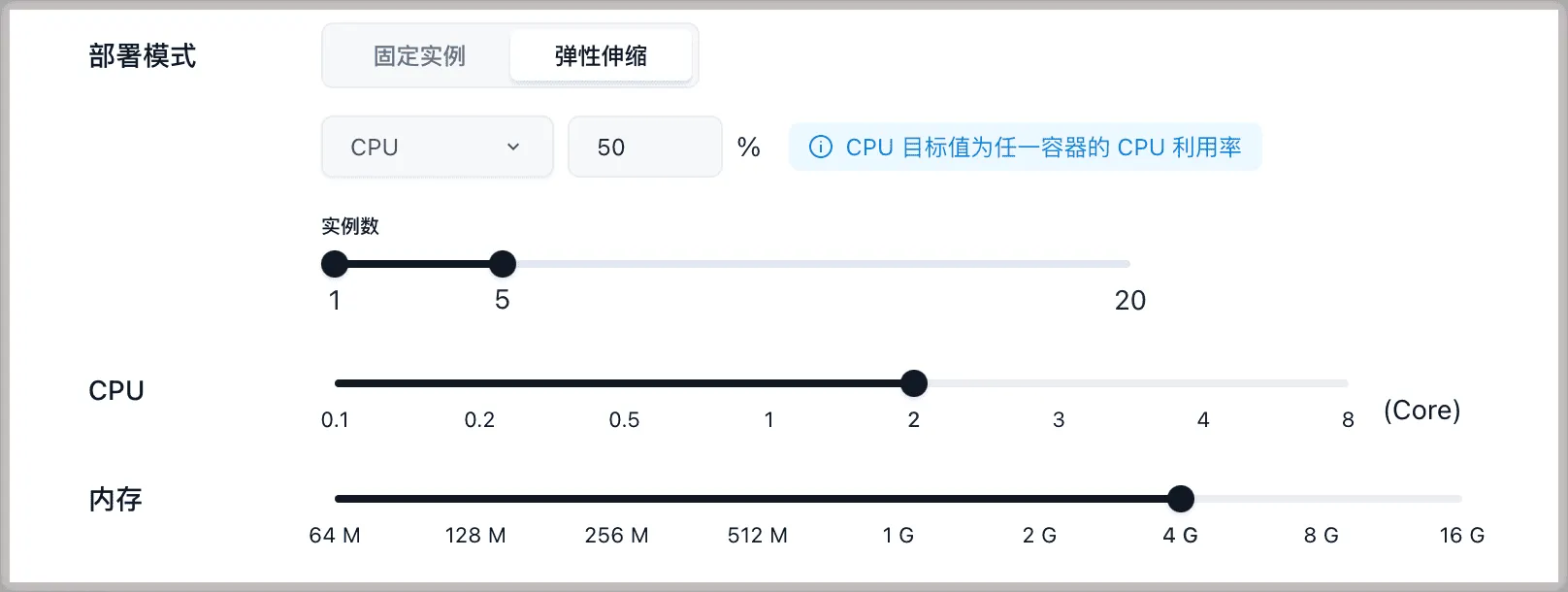 如果未来网站流量过大,可以点击「部署模式」为弹性伸缩,这样服务器会根据流量和负载情况自动扩充配置,避免程序宕机。
