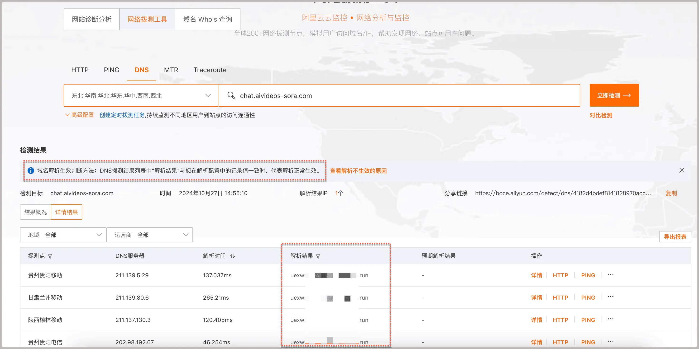 为了检查配置是否生效,点击新增记录右侧的 生效检测。当解析结果和配置的记录值一致,则代表成功。