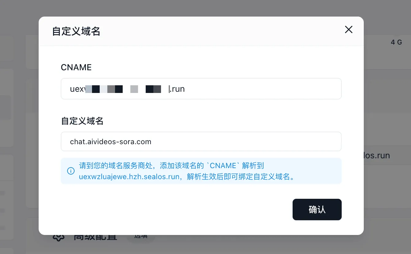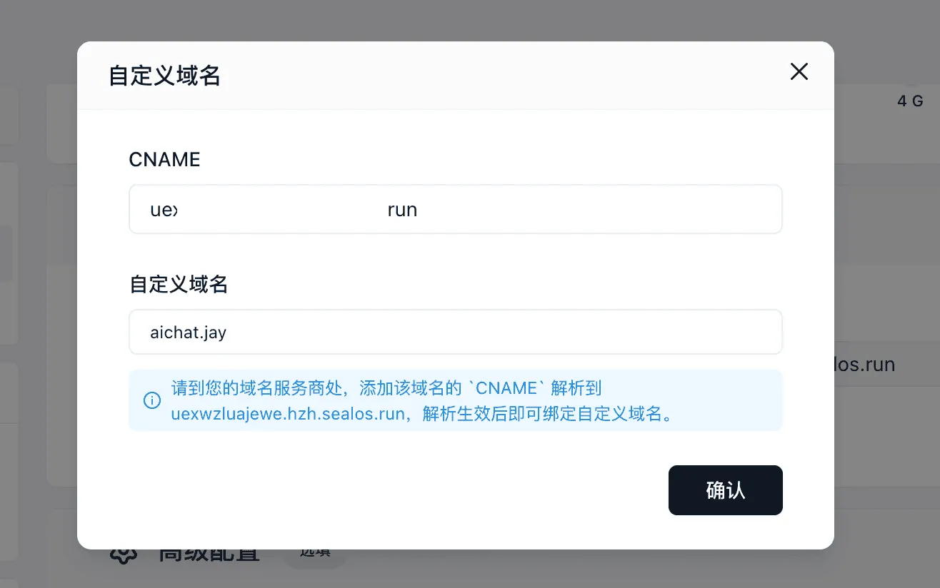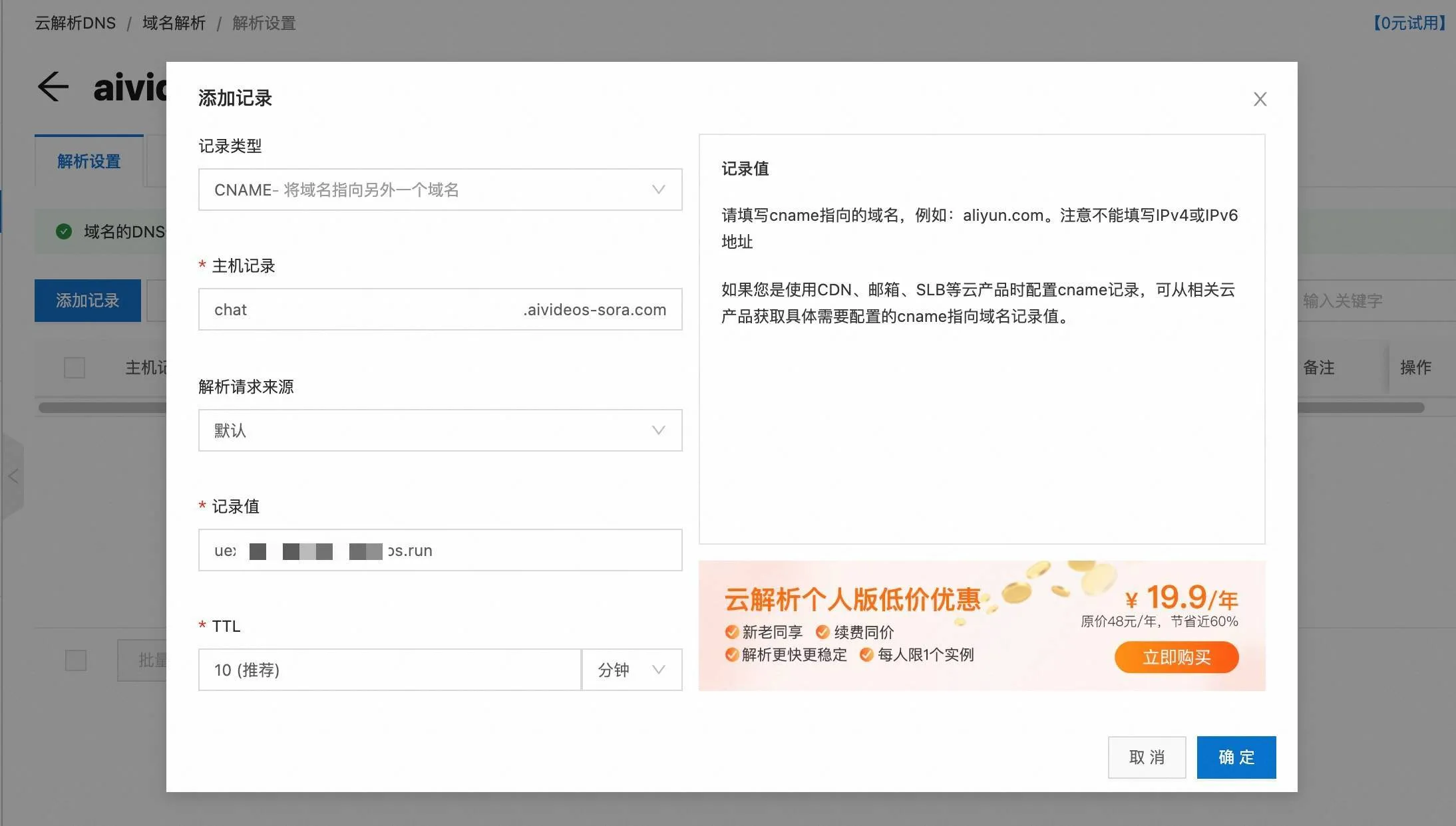 记录类型 选择 CNAME,主机记录 根据喜好填写一个自定义的二级域名,记录值 填写 Devbox 提供的域名,最后确定。