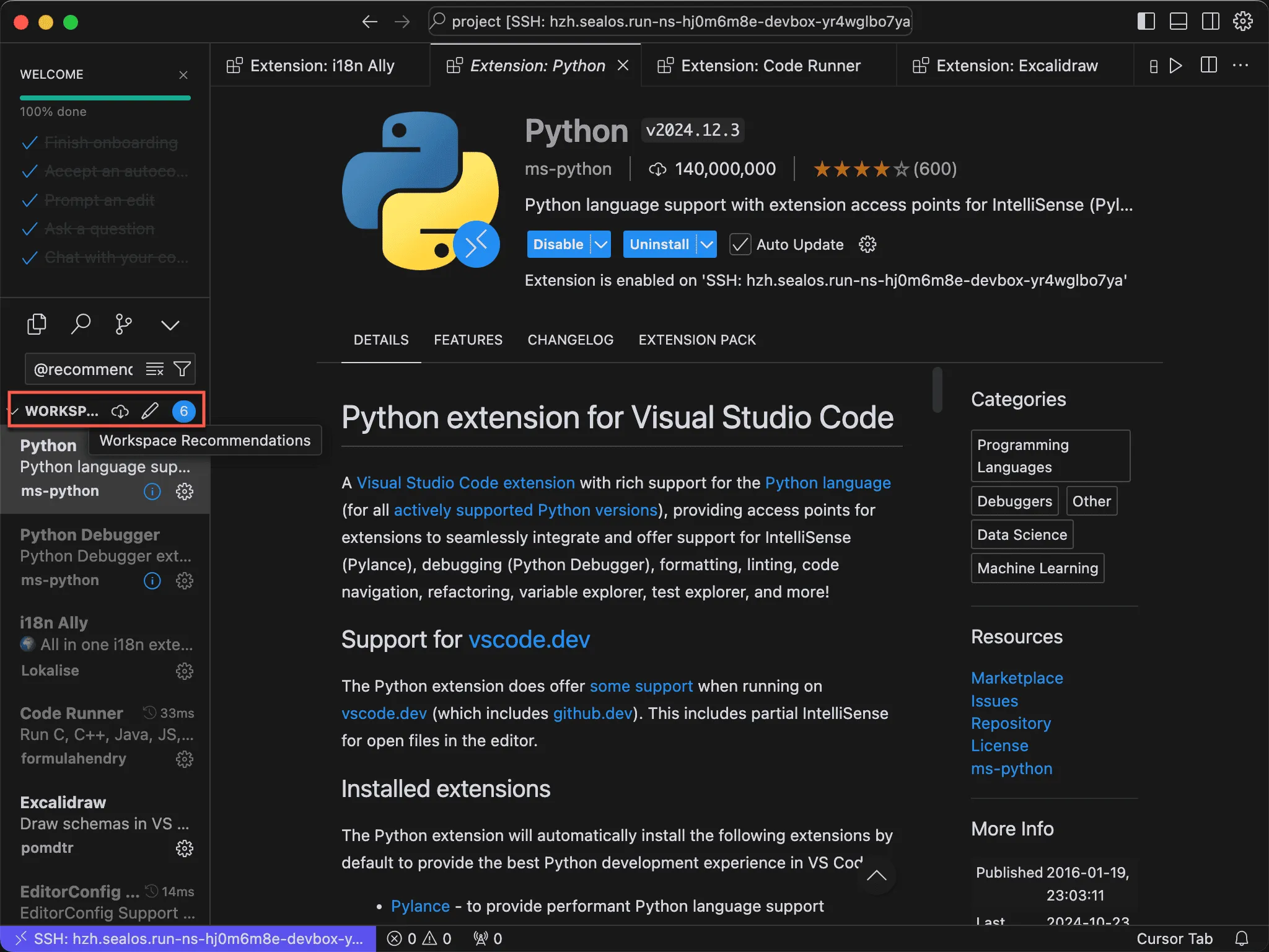 等待推荐的插件安装完成,出现 Disable 或 Uninstall 按钮则代表安装成功。