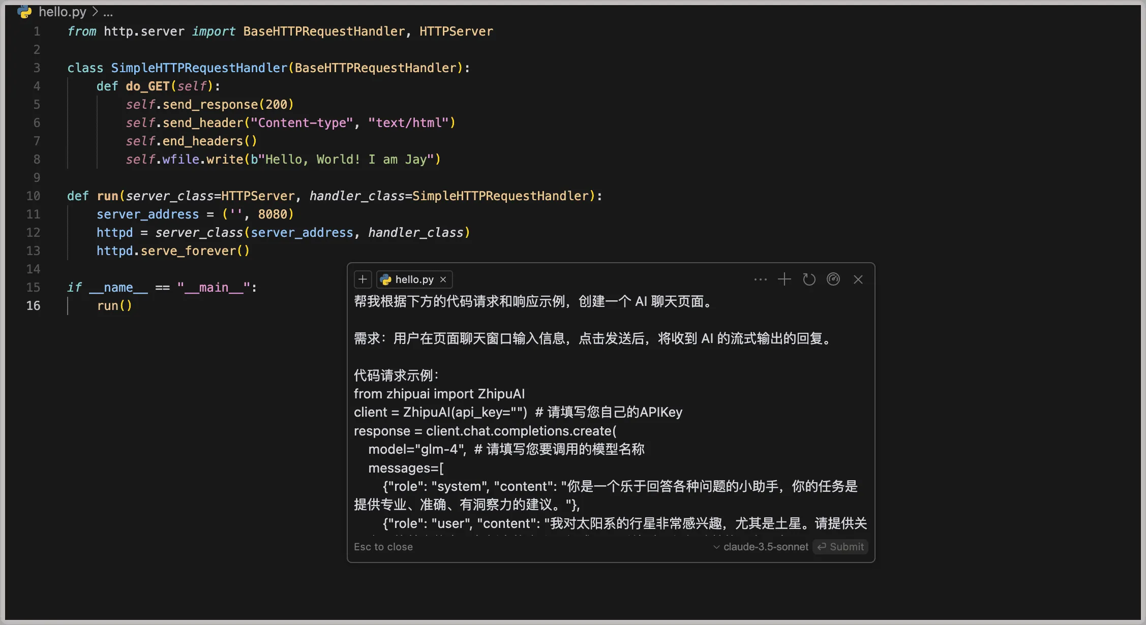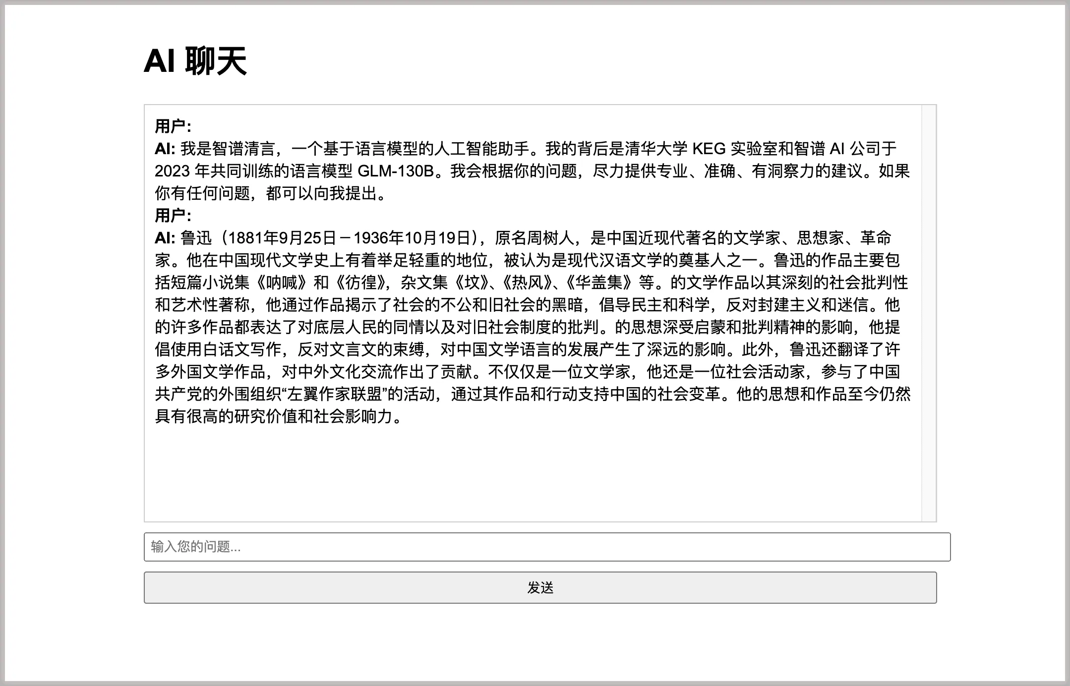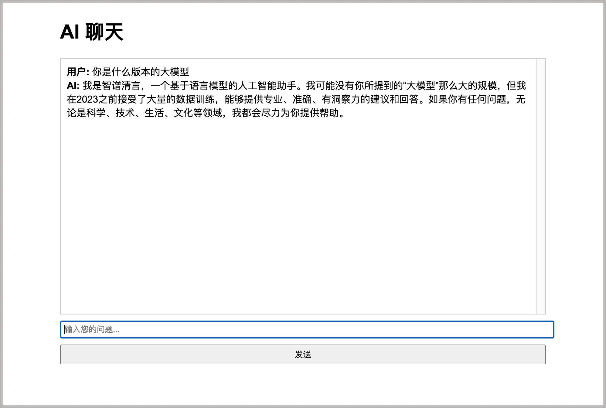 「Hello World」太简单了。接下来,我们以一个真实有效的小案例——接入智谱大模型的 AI 聊天工具 来展示全过程。