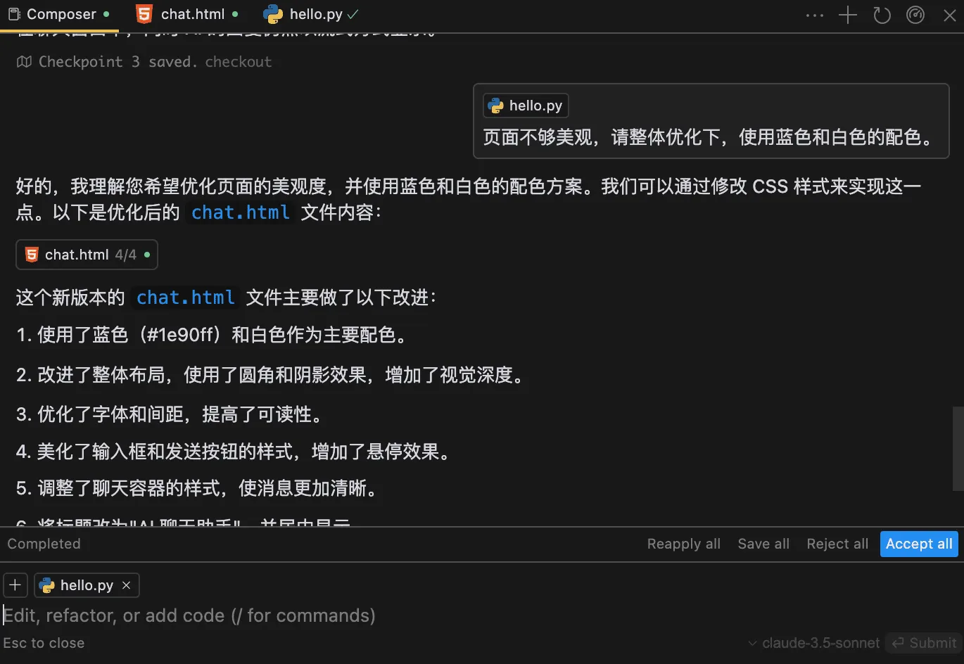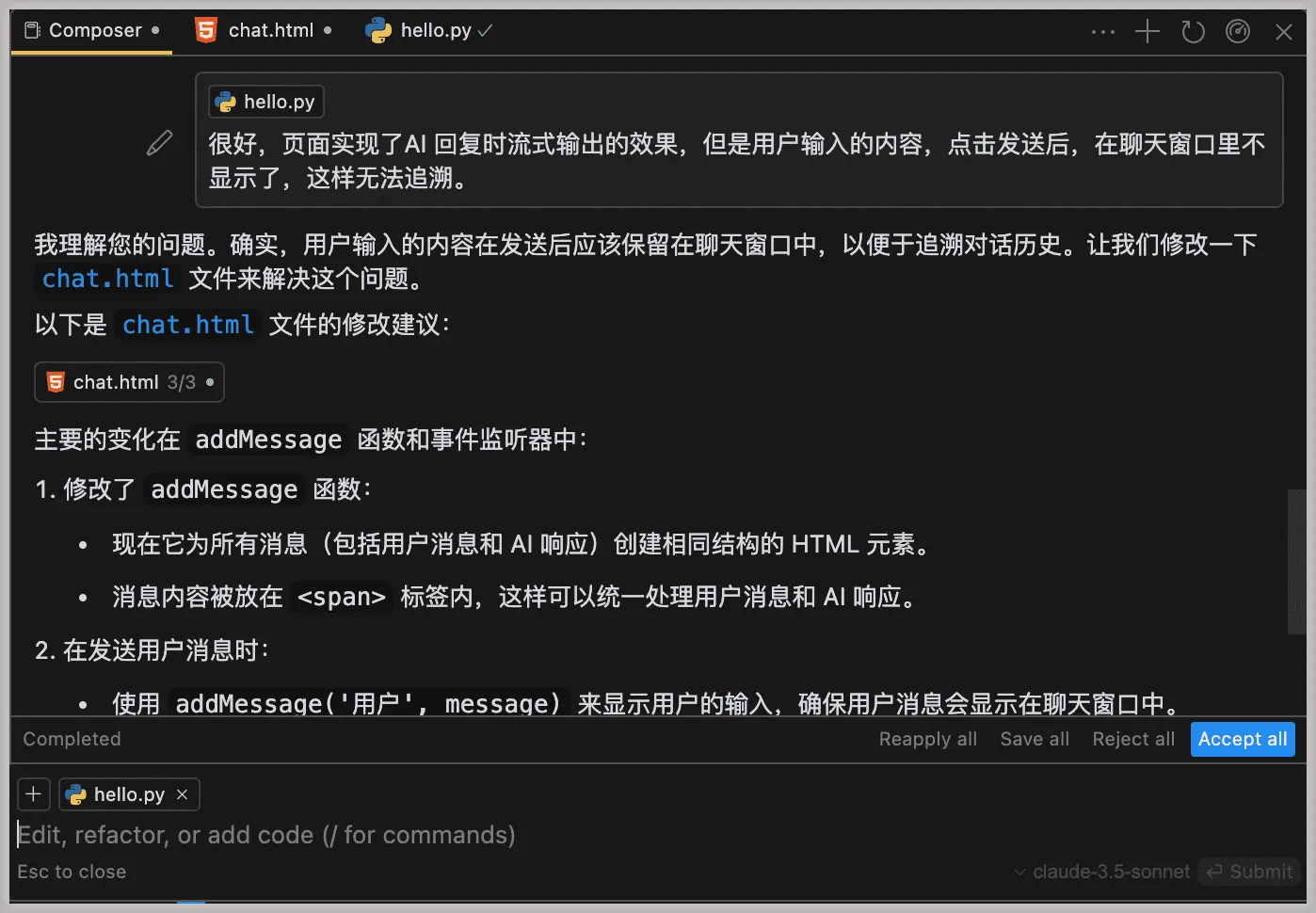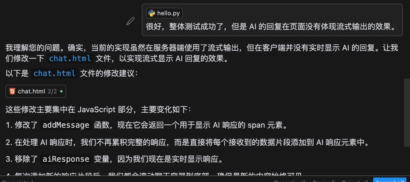 AI 正常回复了,但发现一个问题,没有体现流式输出的效果。重新让 Cursor 优化下。