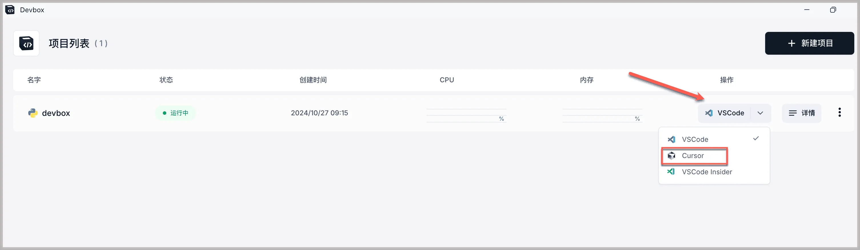 创建项目后,在操作列选择 Cursor,记得单击它。