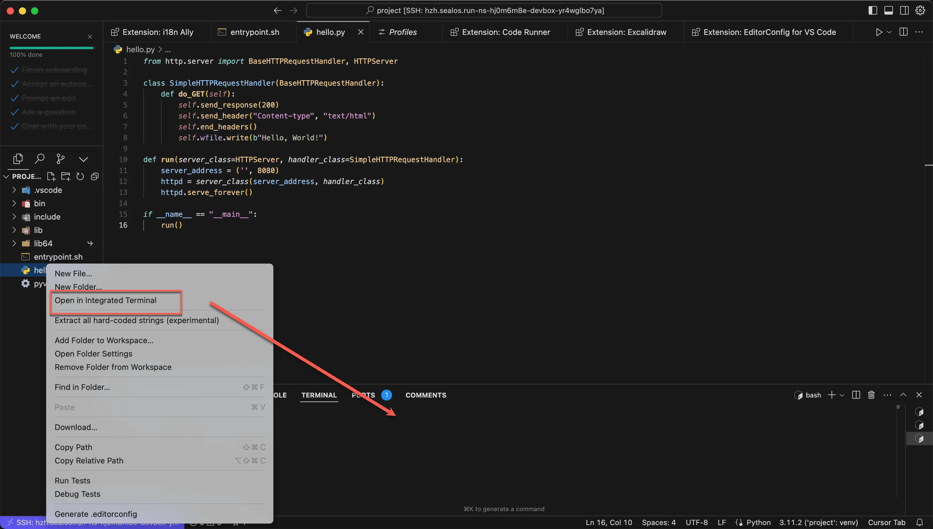 在左下方右击空白处,点击 Open in integrated Terminal 打开控制台。