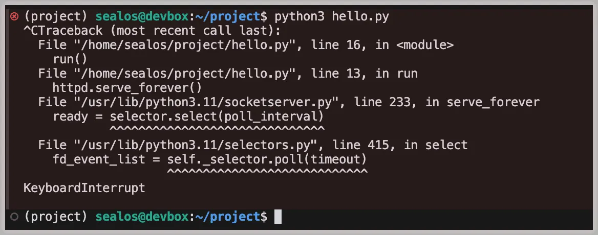 在控制台按 Ctrl + C 关闭应用,再输入命令 python3 hello.py 重新启动。